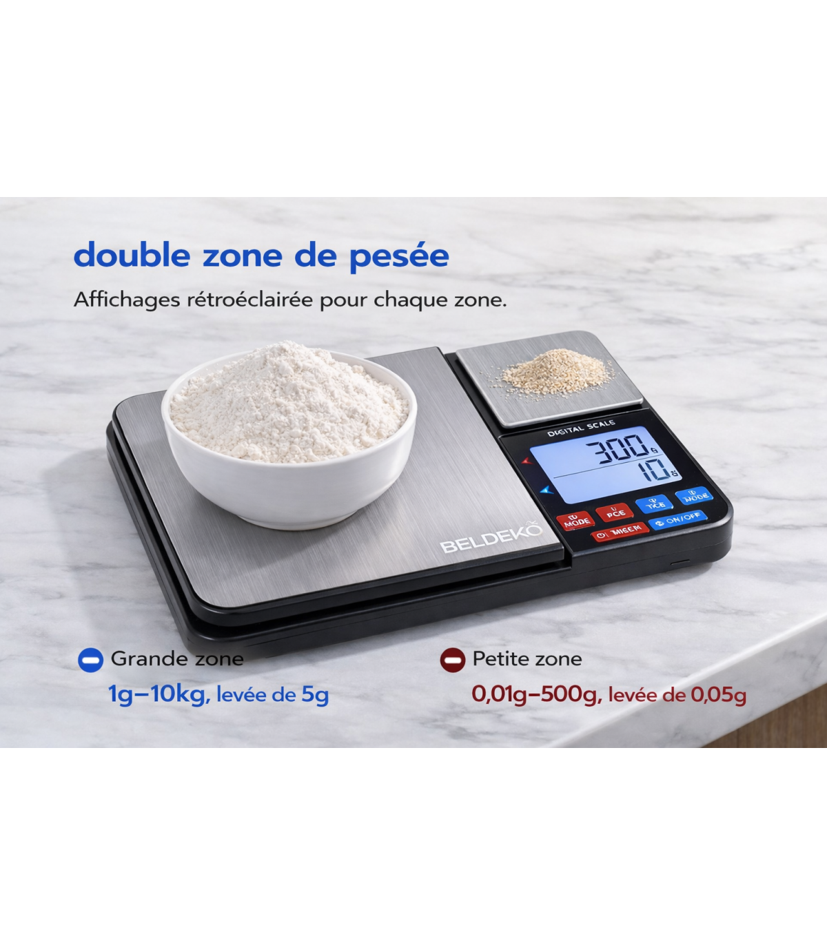 Balance de cuisine double précision – 0,01 g à 500 g + 1 g à 5 kg – Idéale pour levure, sel, farine et pâtisserie