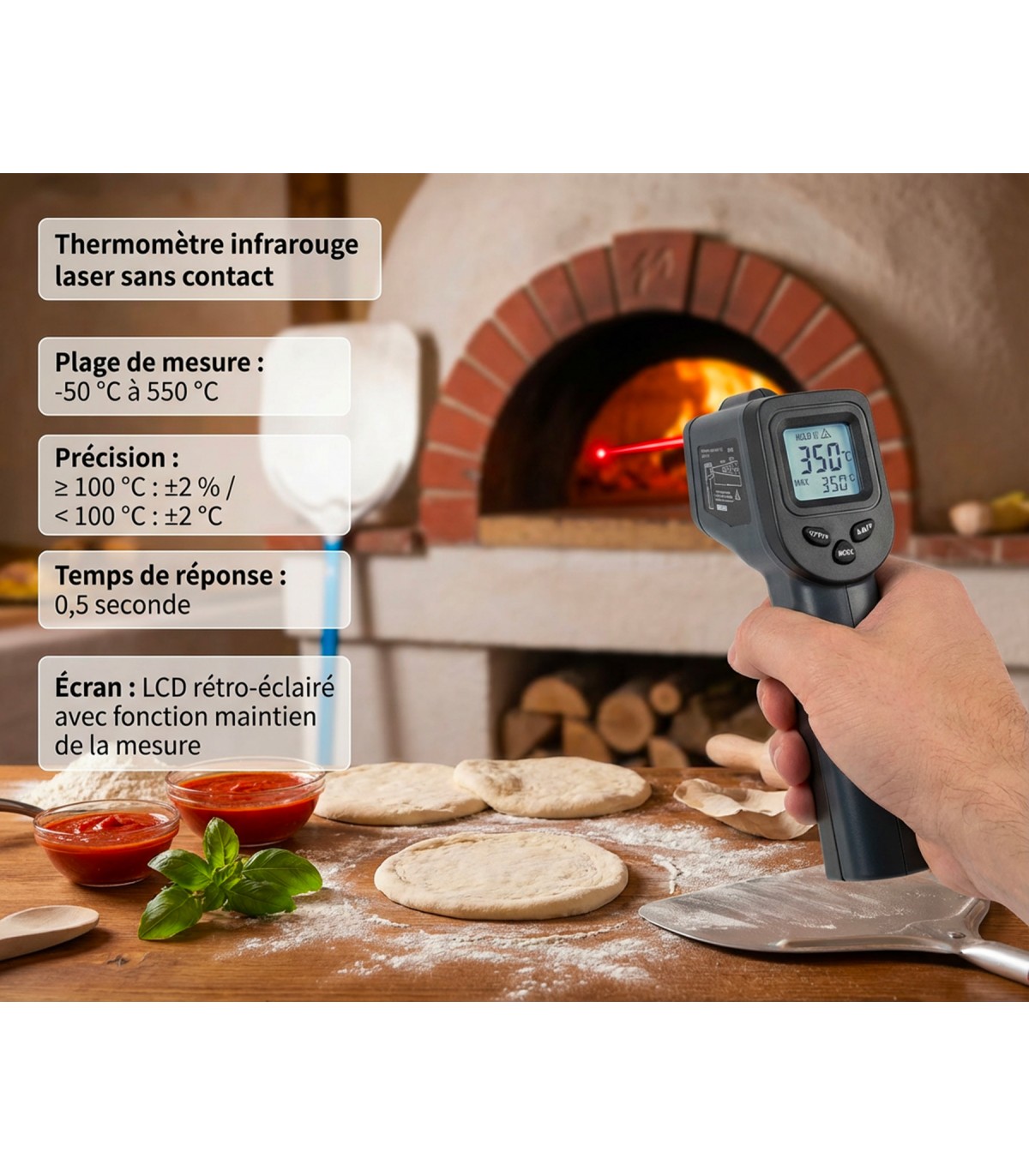Le thermomètre laser BELDEKO est parfaitement adapté aux fours à pizza à bois, à gaz ou électriques, mais convient également à de nombreuses applications alimentaires et techniques.