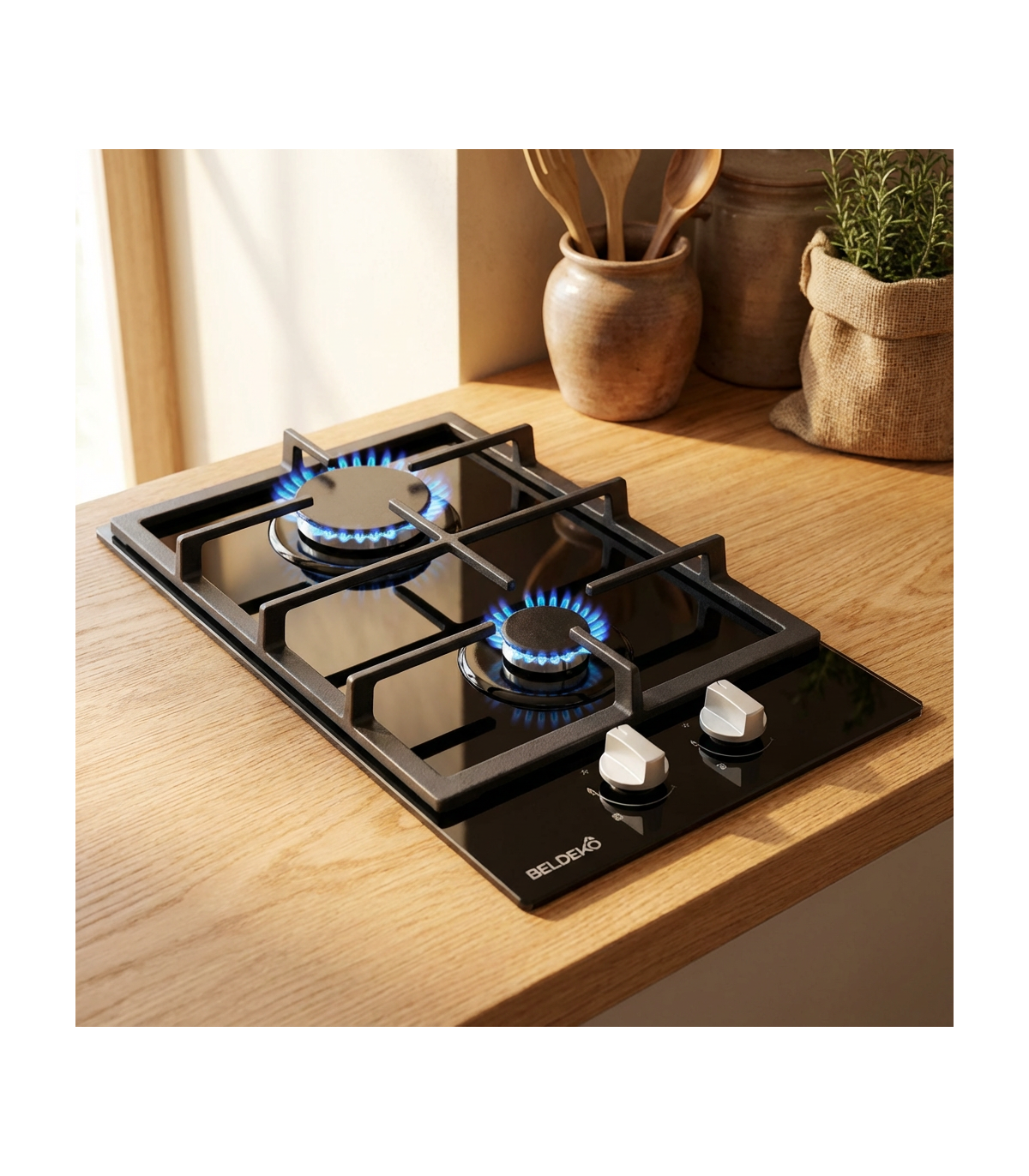 Même les petits espaces ont le droit à des matériaux élégants et de qualité ! Le verre noir et la fonte (grille et chapeaux des brûleurs) sont durables et faciles à entretenir. Les deux manettes de couleur gris silver viennent parfaire l’esthétique de notre table de cuisson.