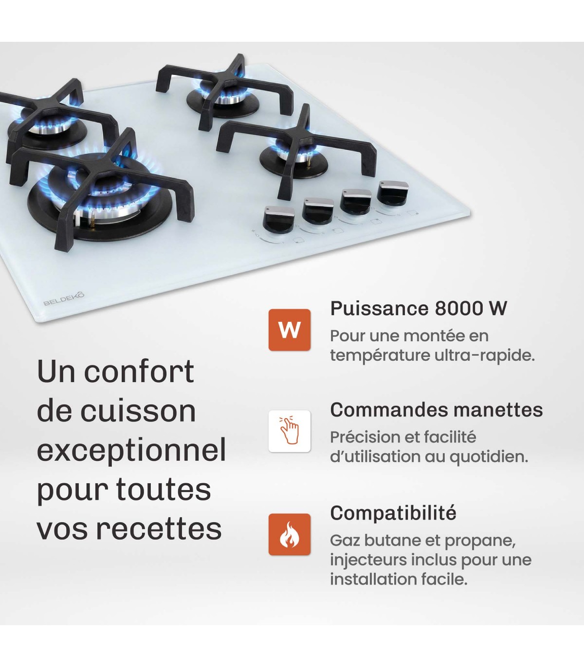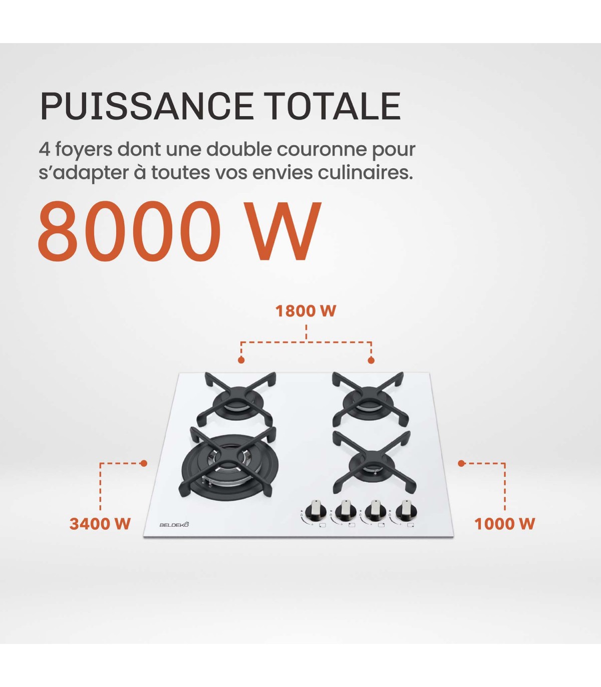 Apportez élégance et performance à votre cuisine avec cette plaque de cuisson gaz 4 foyers en verre blanc dépoli. Équipée d’un puissant brûleur double couronne de 3400 W, de deux foyers de 1800 W et d’un foyer de 1000 W, elle s’adapte à toutes vos préparations, du mijotage délicat aux cuissons intensives. Son verre de sécurité 8 mm, ses commandes manuelles précises et son design moderne en font un choix idéal pour une cuisine performante et raffinée.