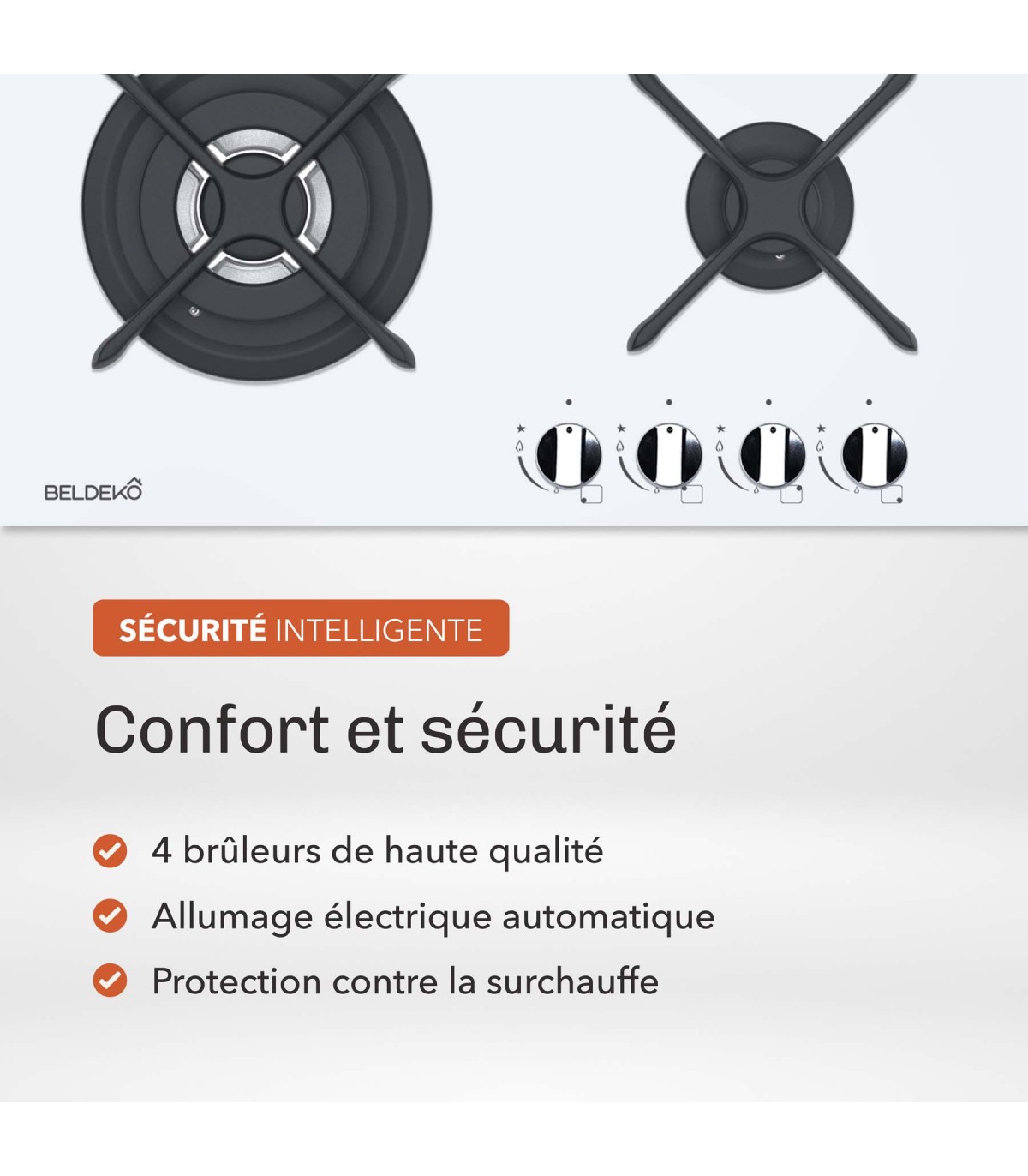Cette table de cuisson est équipée de quatre brûleurs en fonte, reconnus pour leur solidité et leur excellente diffusion de la chaleur :