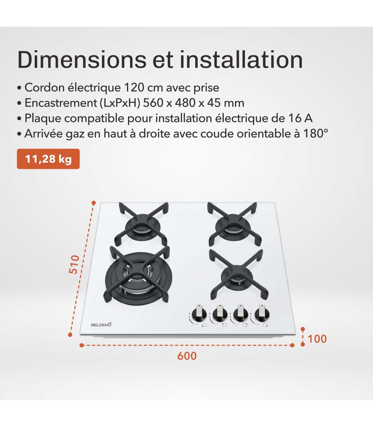 - Encastrement : 560 x 480 x 45 mm