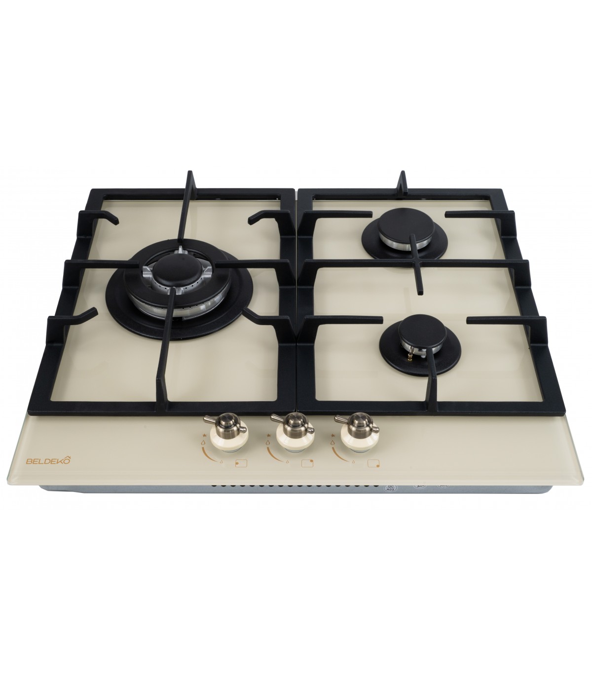 Matières : Surface en verre athermique, supports de brûleurs en inox, grilles et chapeaux en fonte