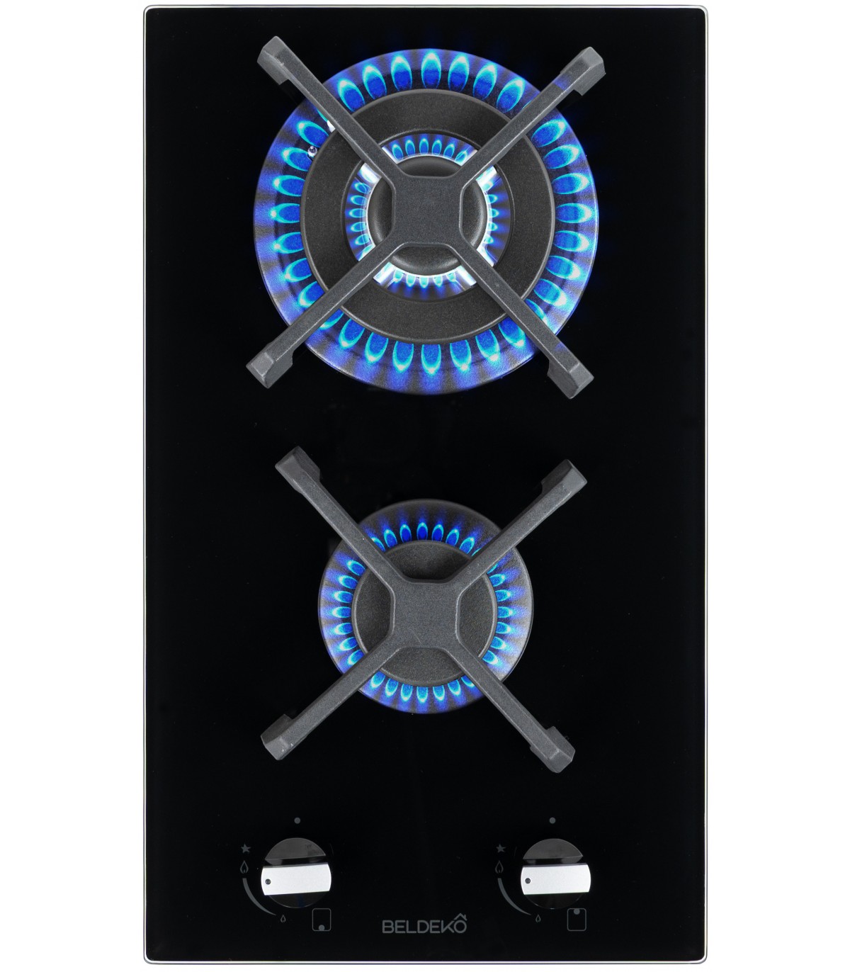 - Matières : Surface en verre athermique, supports de brûleurs en fonte, grilles et chapeaux en fonte