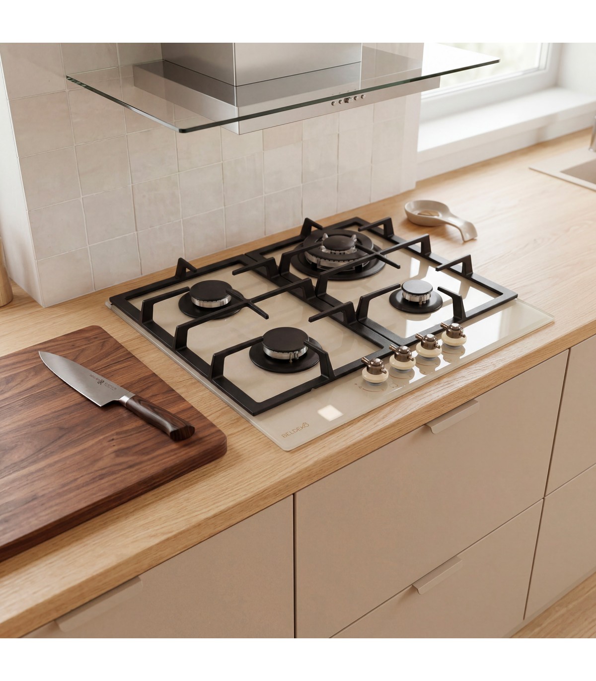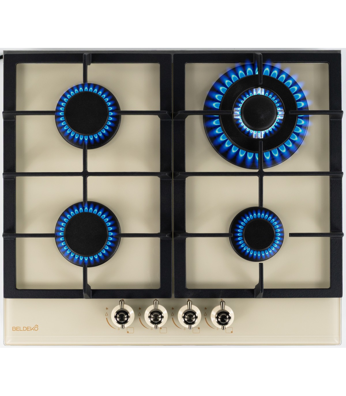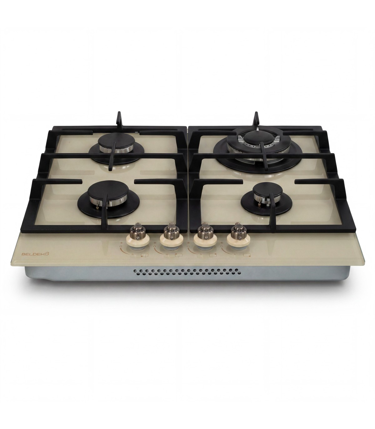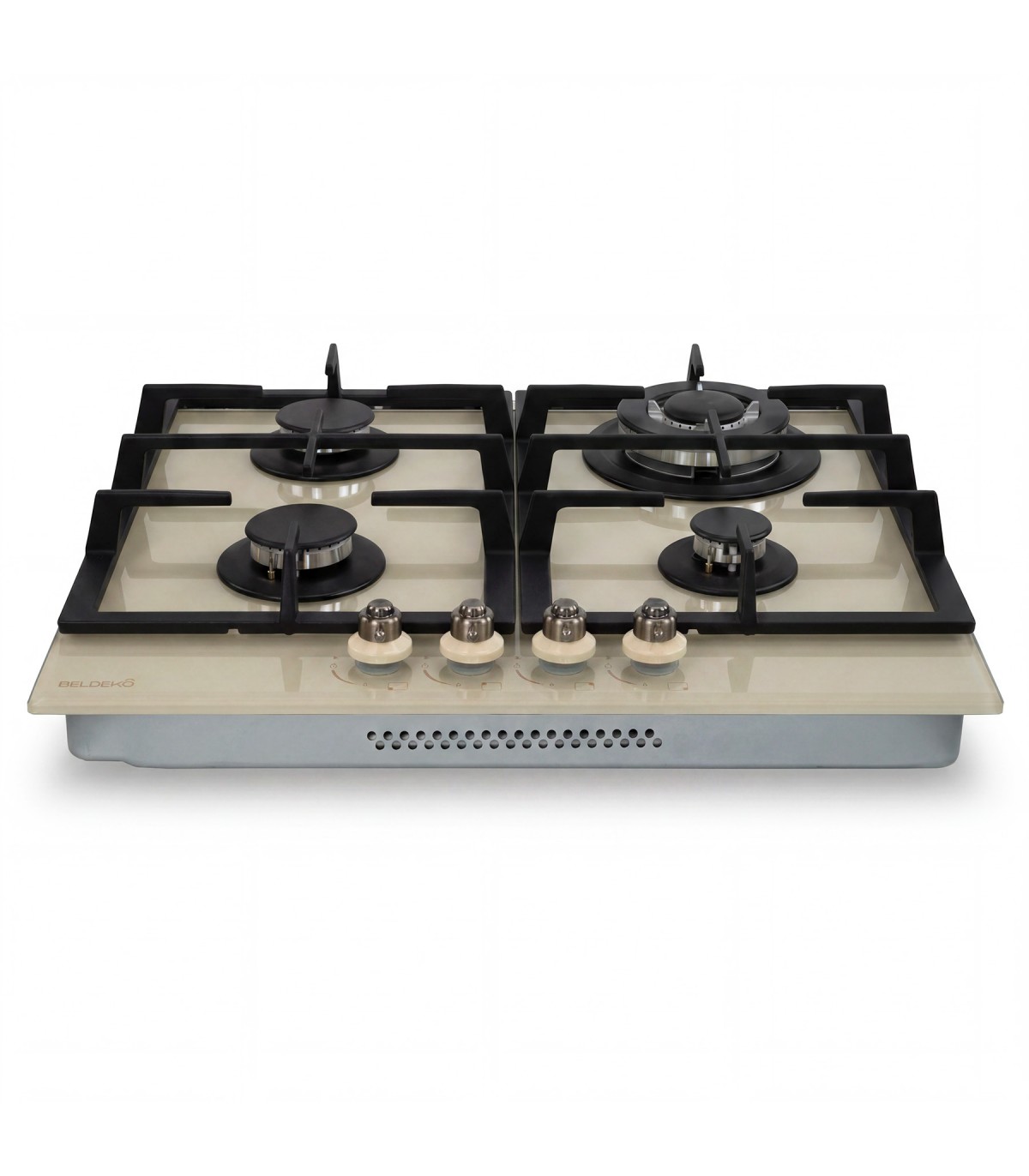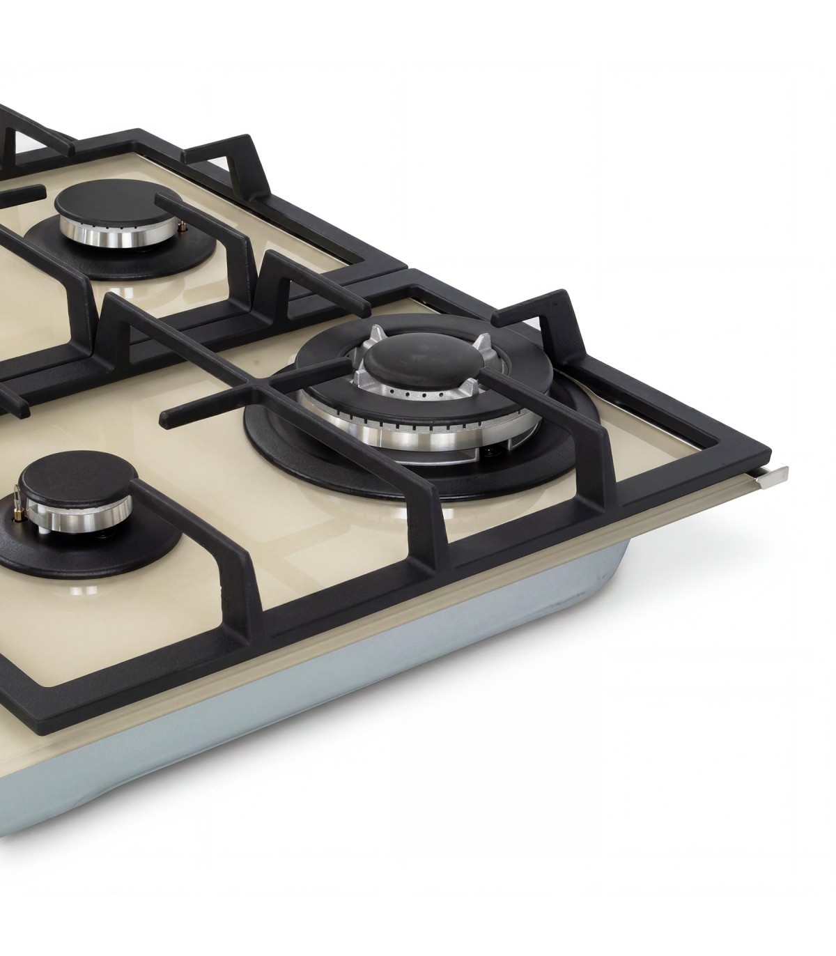 Plaque gaz 4 foyers en verre beige brillant, alliant modernité et praticité. Coloris chaleureux pour une cuisine raffinée et contemporaine.