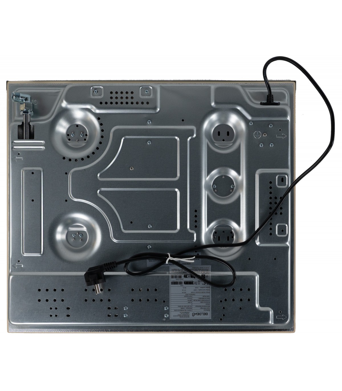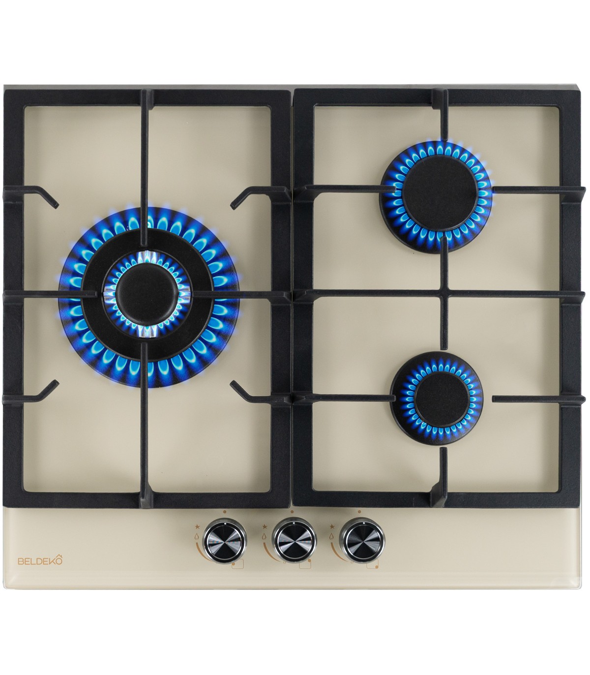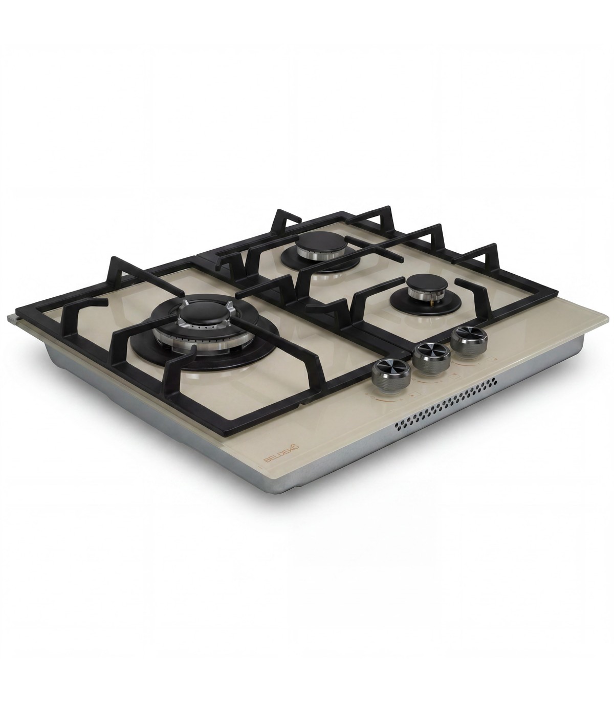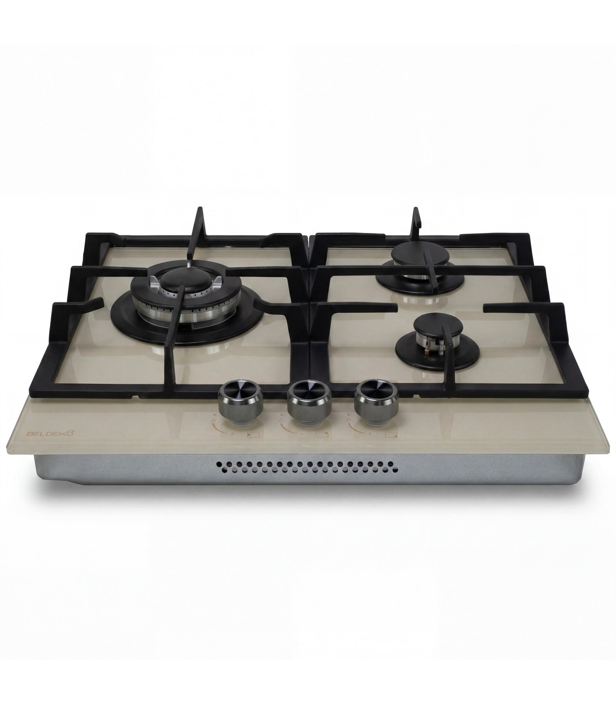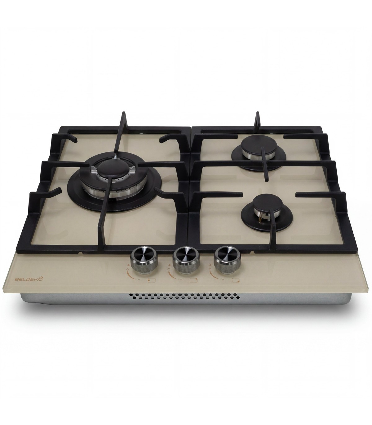 Matières : Surface en verre athermique, supports de brûleurs en inox, grilles et chapeaux en fonte