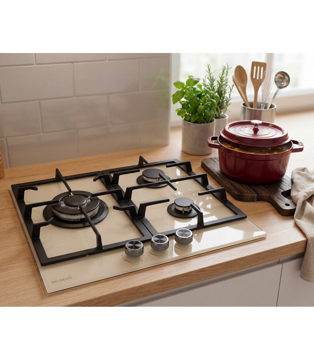 La surface en verre beige apporte une esthétique contemporaine et lumineuse à votre cuisine tout en facilitant l’entretien au quotidien.