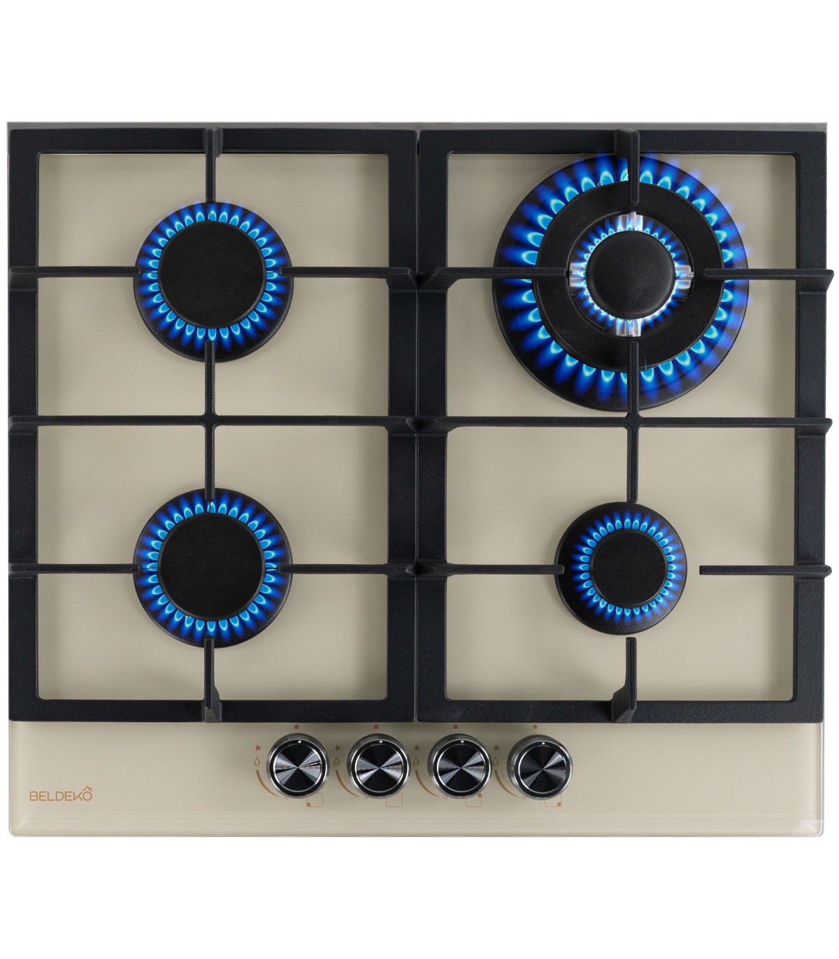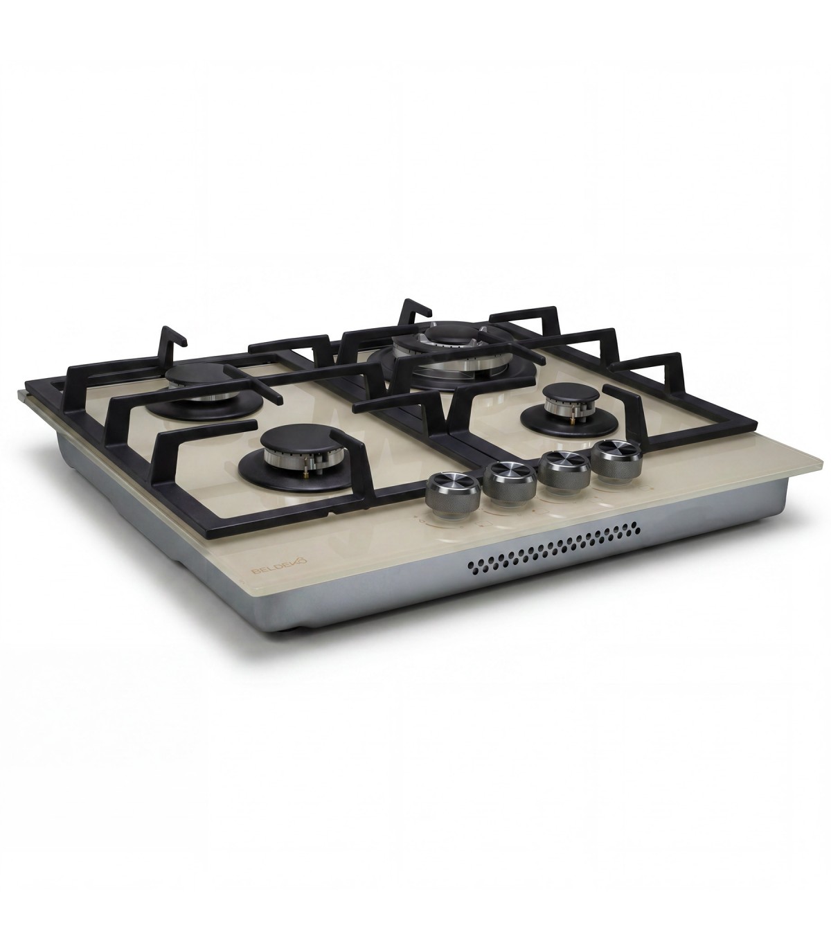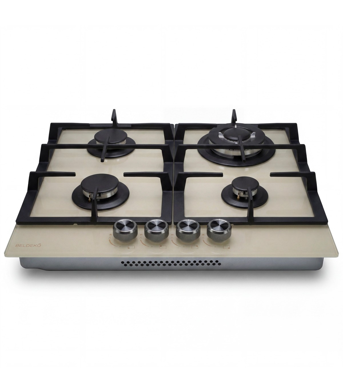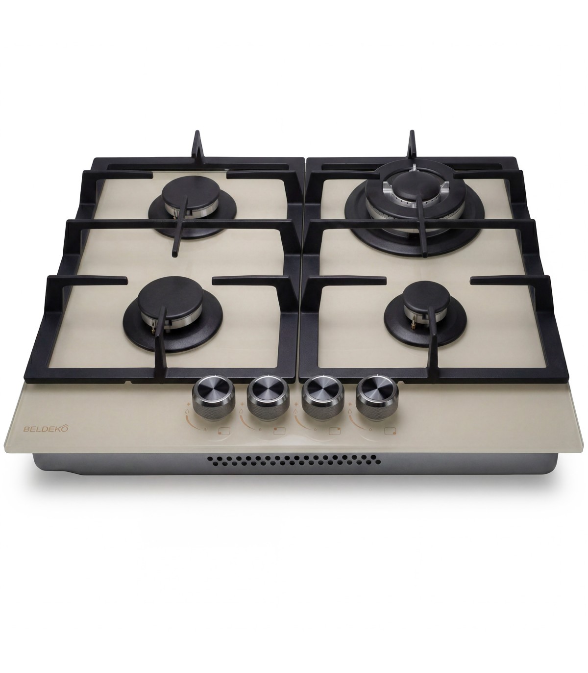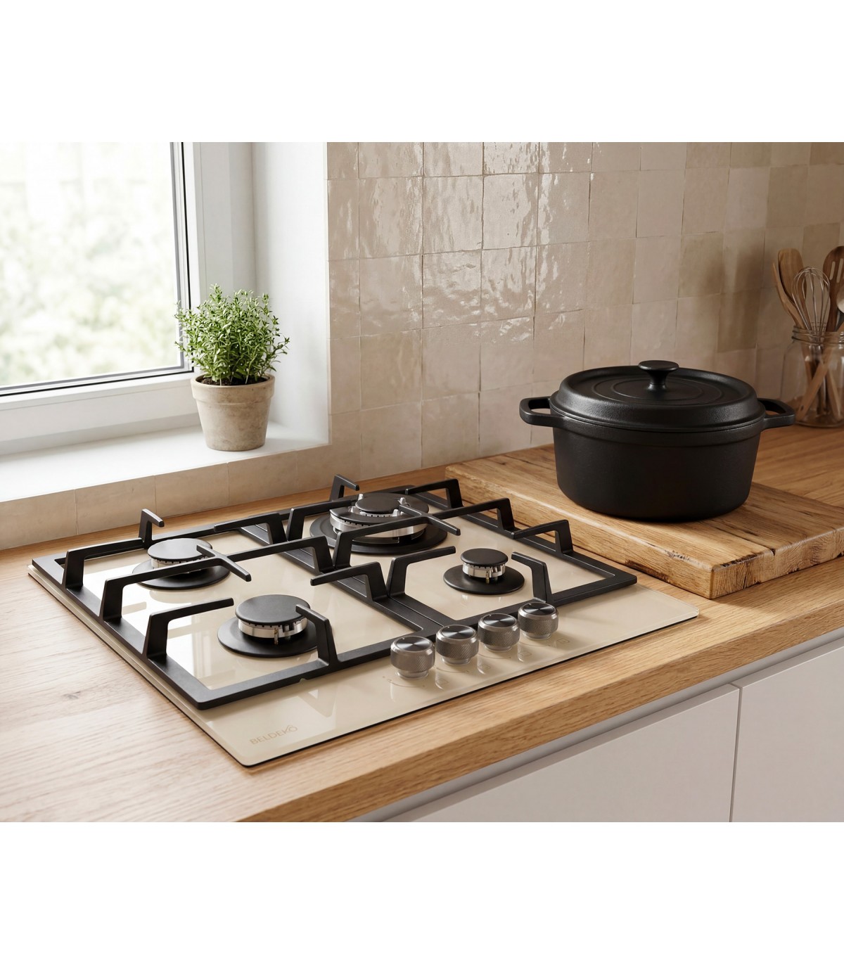 Plaque gaz 4 foyers en verre beige brillant, alliant modernité et praticité. Coloris chaleureux pour une cuisine raffinée et contemporaine.