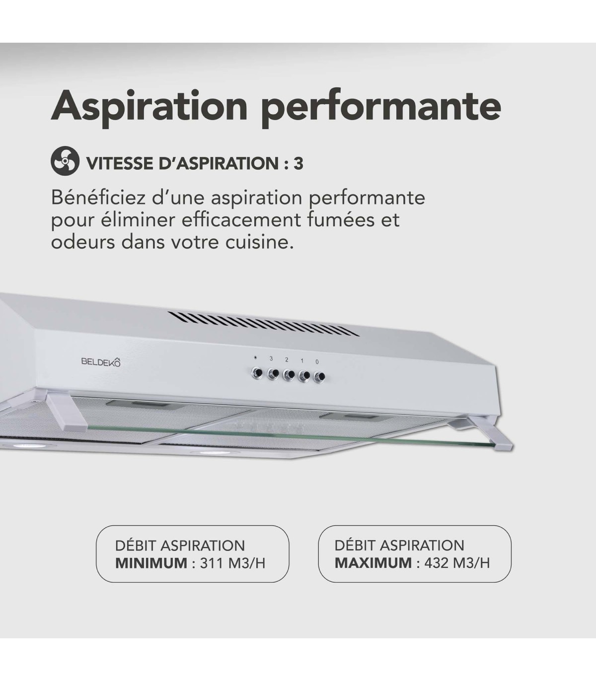Cette hotte casquette visière blanche de 60 cm offre des performances exceptionnelles grâce à ses deux moteurs de 100 W chacun, une capacité d’aspiration de 435 m³/h et un éclairage LED de 2 x 1,5 W. Avec trois vitesses et une installation adaptative (évacuation extérieure ou recyclage), elle allie élégance et efficacité pour votre cuisine.