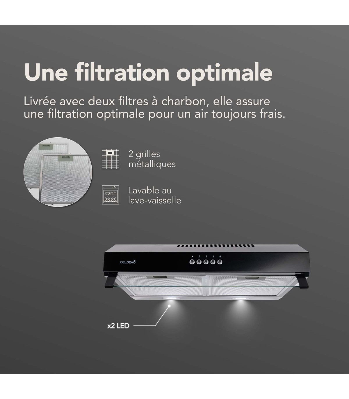 - Filtration optimale : Livrée avec 2 filtres à charbon et 2 filtres à graisse