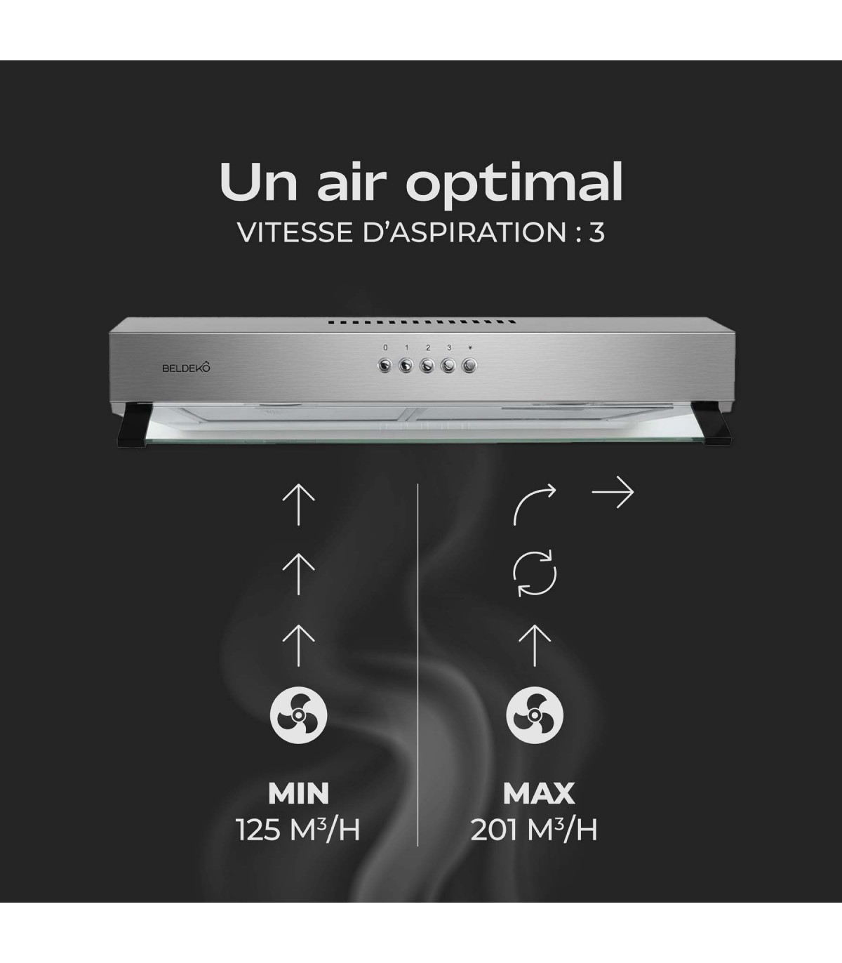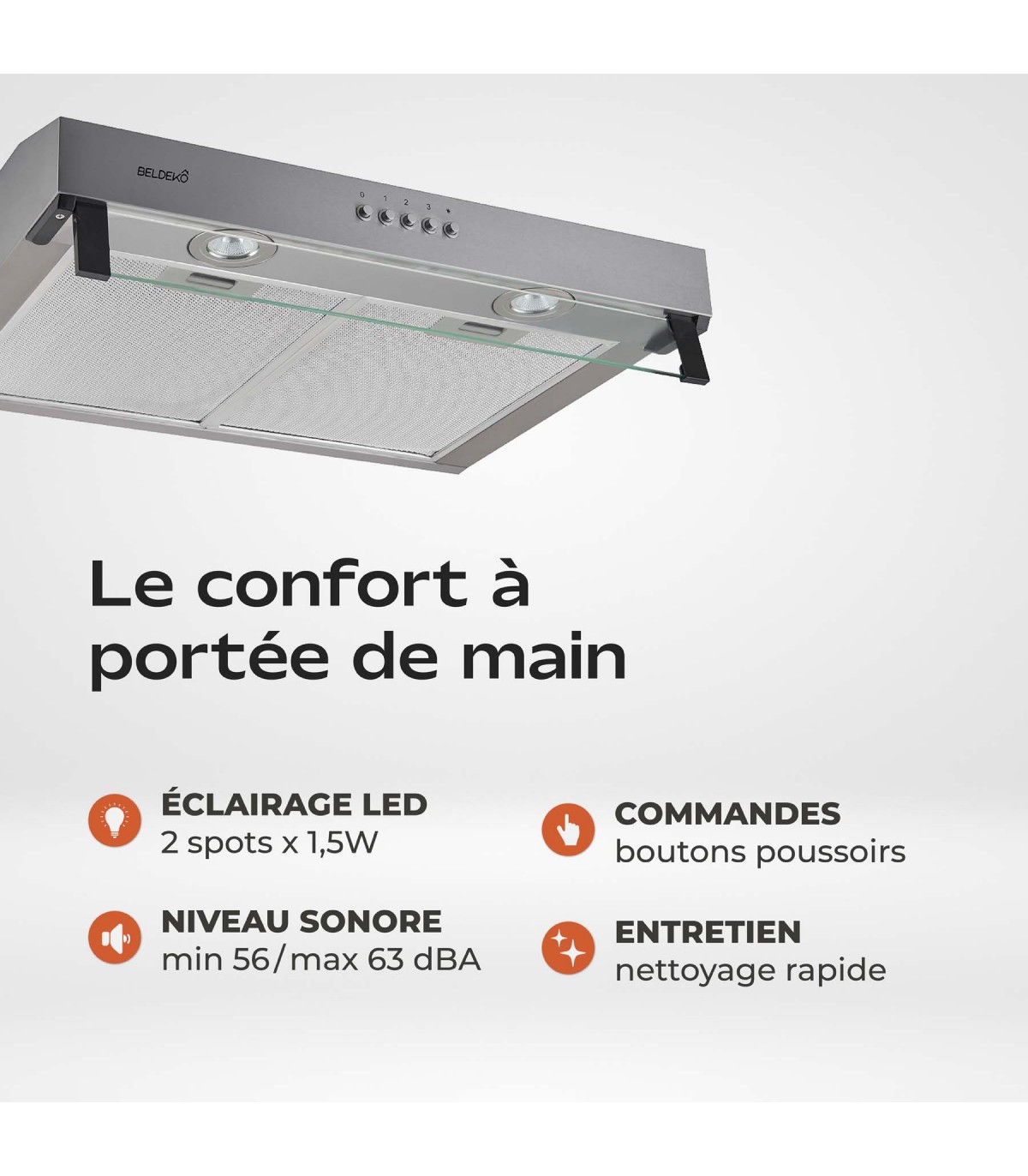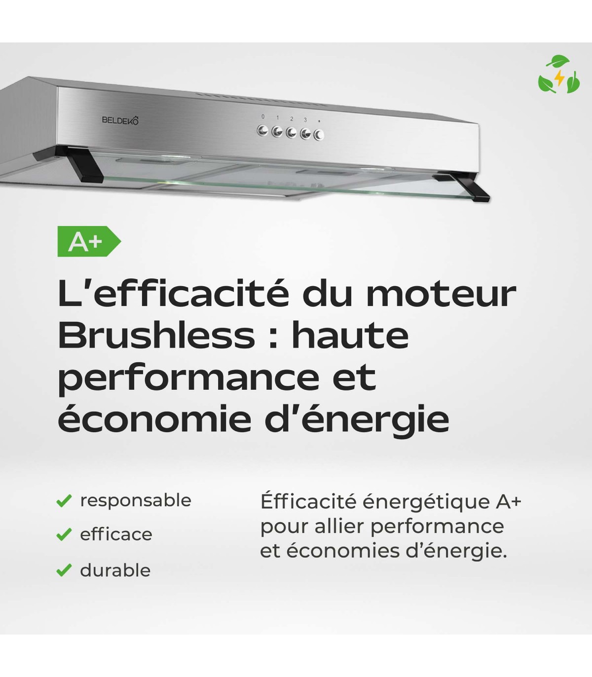Performante contre les fumées et les odeurs, cette hotte vous garantit un air plus sain au quotidien, tout en offrant une excellente efficacité énergétique classée A+, pour une consommation maîtrisée sans compromis sur les performances.