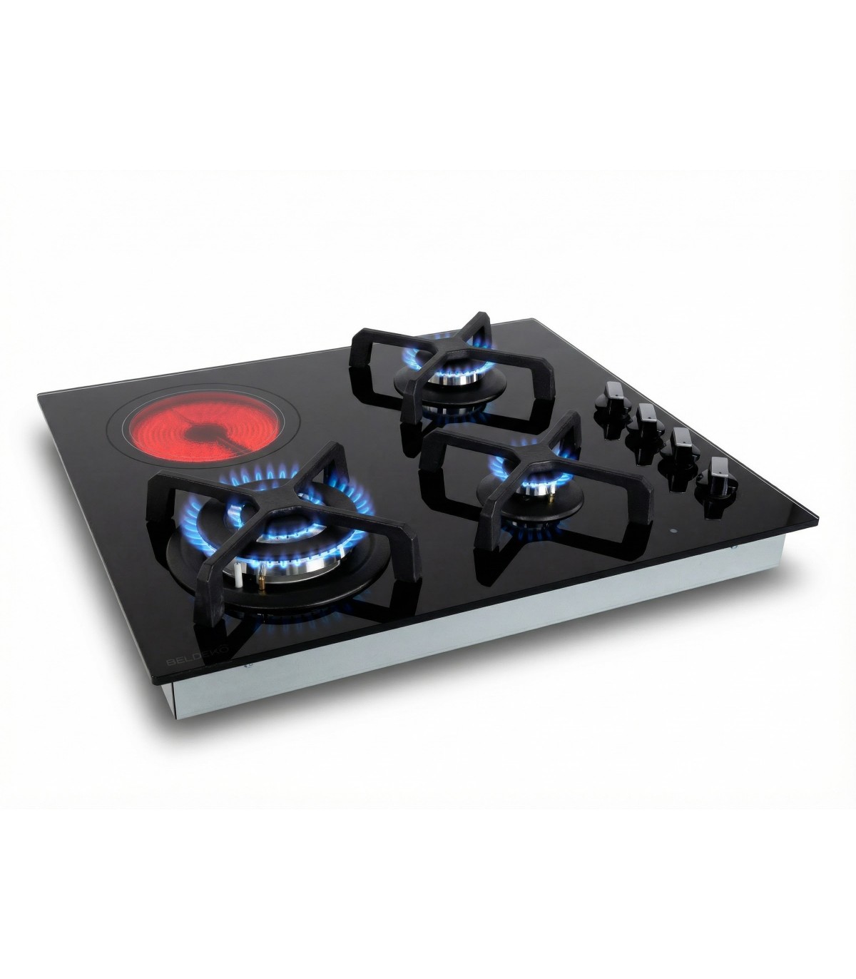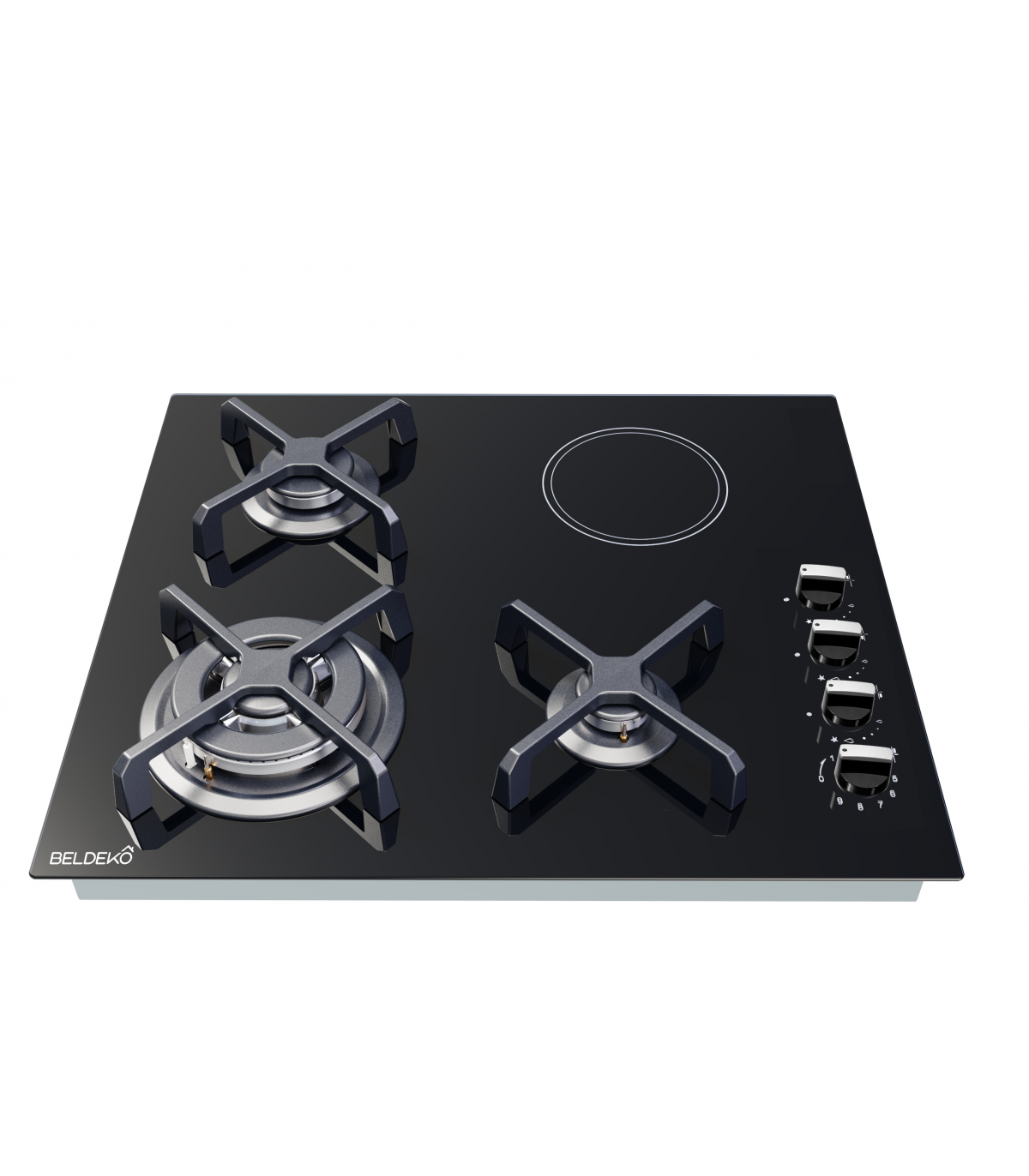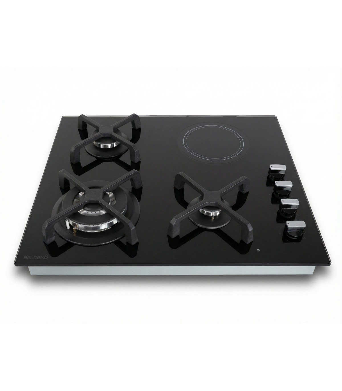 Alliez puissance du gaz et praticité de la vitrocéramique avec cette plaque de cuisson mixte 3 foyers gaz + 1 foyer vitrocéramique BELDEKO.