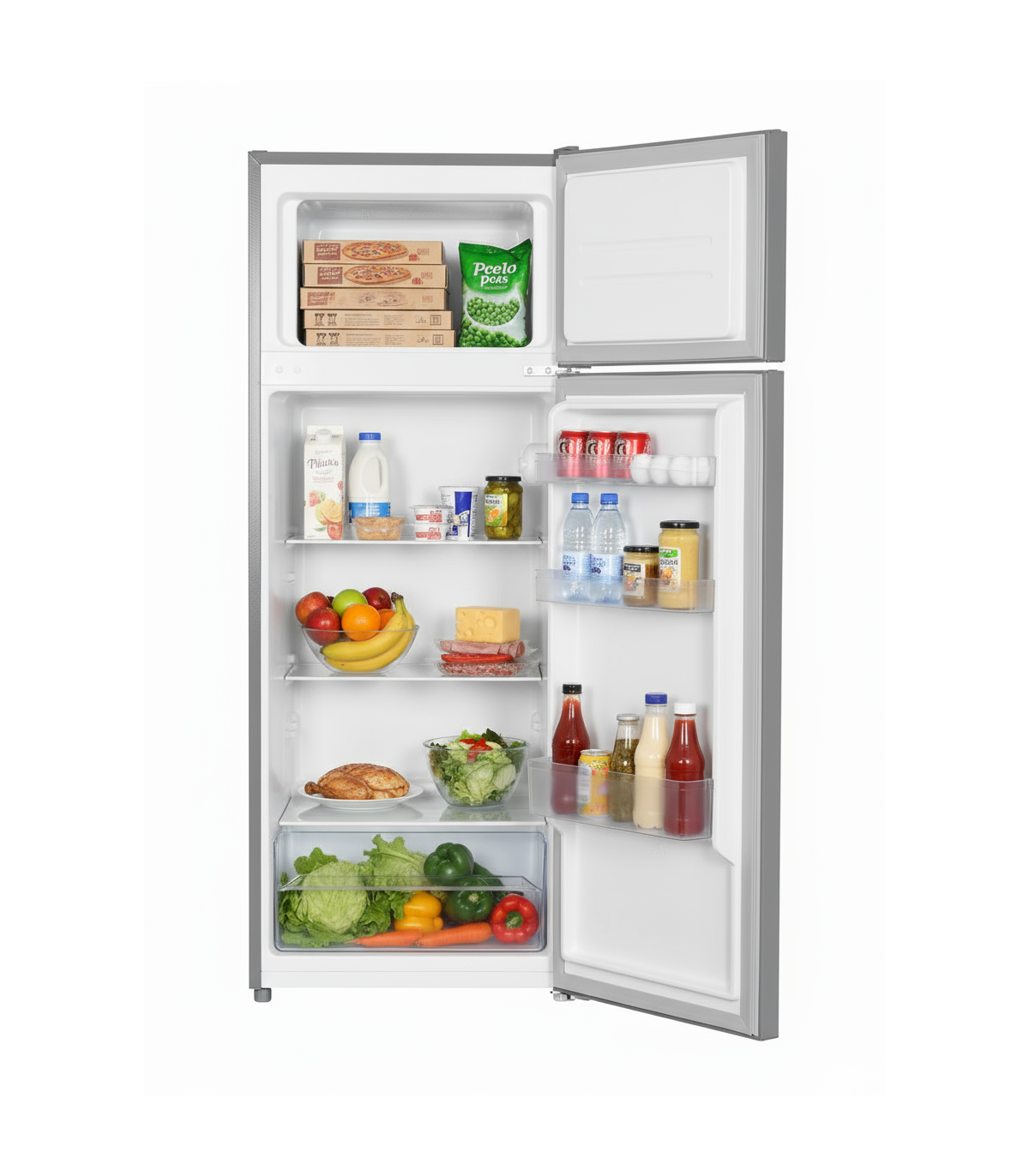 Réfrigérateur encastrable top de 121 L avec congélateur, réglage lumineux de la température, bac à légumes et ventilation frontale, conçu pour une installation sous plan de travail.